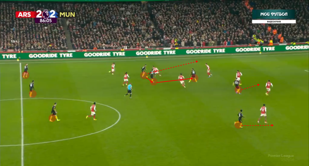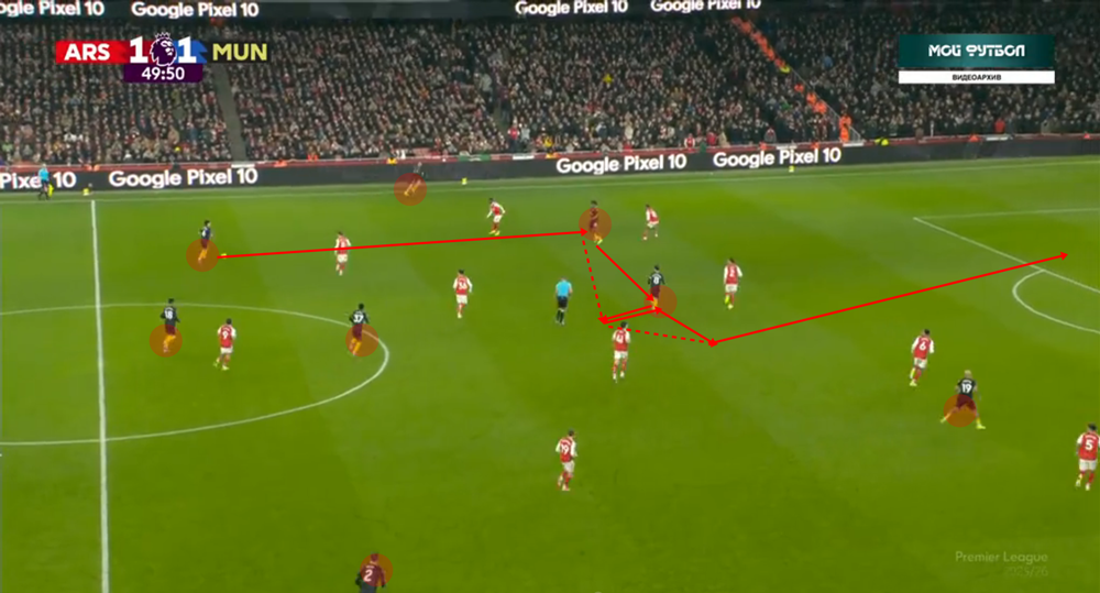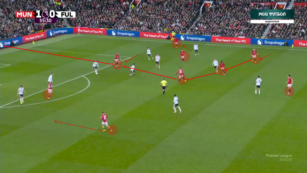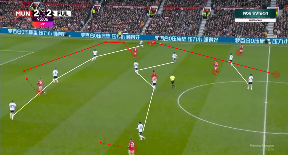 A szélen vezetett támadásoknál is látványos, mennyire tudatosan keresik a játékosok a vonalak közötti játék lehetőségét: a bal oldalt Luke Shaw, a jobb oldalt pedig Amad a vonal mellett helyezkedve is általában befelé veszi át a labdát. Fernandes és Cunha rugalmas helyezkedése pedig gyakran a többieket is mozgásra készteti, ezáltal tempóelőnyt teremtve az ellenfelek ellen. Ha pedig felállt fal ellen nem megy, kontrából és visszatámadásból is lehet veszélyeztetni.