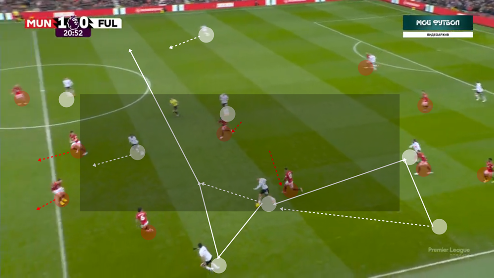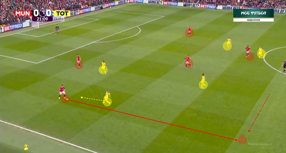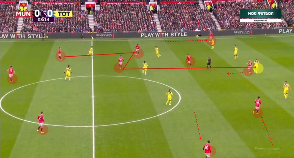 A labdakihozatal kezdetén tehát a United négy védője igyekszik széltében széthúzni a pályát, cél a lendületes támadás előkészítése. Hogy a United játéka mennyire célirányos, az is mutatja: akciónként átlagosan 12,06 passzt teljesítenek átlagosan a saját térfelükön, ami csak a tizedik a mezőnyben. Van, hogy agresszívabb letámadás ellen Lammens egyszerűen csak felíveli a labdát, erről majd később. De ha van elég tér és idő, direkten kihozzák a labdát. Ilyen szituáció kevesebb van, de előnye, hogy az ellenfél térfelén való berendezkedés helyett azonnal is képesek áttörni: a támadó négyes ilyenkor szabadon helyezkedik, helycserékkel, kényszerítőkkel pedig a pozíciós kontroll helyett azonnal elmozgó játékra lehet váltani. A két szélső védő közül pedig általában baloldalt Luke Shaw fut fel többet.