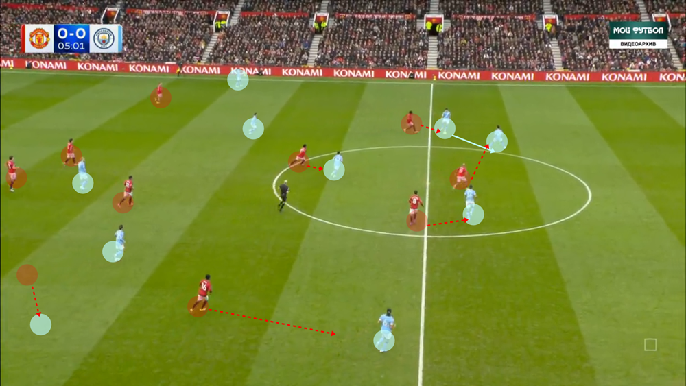 Nagyon fontos kiegészítő elem, hogy a United védelmi blokkja bizonyos jelekre meglepetésszerűen kimozdul a középső blokkból – a váratlanságnál fogva ez néha hatékonyabb is, mintha a fizikai kimerülésig, az egész pályán üldöznék az ellenfeleket. Így sikerült egy-egy gólt szerezni a City és az Arsenal ellen is: ha az ellenfél szélsővédői felléptek, és a szerkezetük kissé megnyúlt, Mbeumoék létszámfölényes szituációban tudtak labdát szerezni, a kontrából azonnali gólveszélyt jelentve.