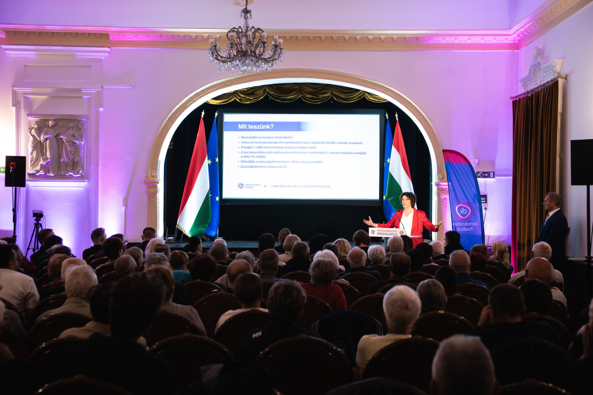 Az ötméteres magasságú, kastélyokba illő tükrökkel felszerelt, rózsaszín fényekkel bevilágított teremben Újpest tavasszal újraválasztott parlamenti képviselője, Varju László konferálta fel Dobrevet, aki nagy tapsot kapott a közönségtől. Miután a pártelnök mindegyik vezető DK-ssal puszizkodott, lendületesen kezdett bele a beszédébe. Rögtön kijelentette, hogy az Orbán-rendszer össze fog omlani, a Fidesz bukása után pedig „hatalmas nagy feladat” vár majd a DK-ra. Új országot kell ugyanis építeni.