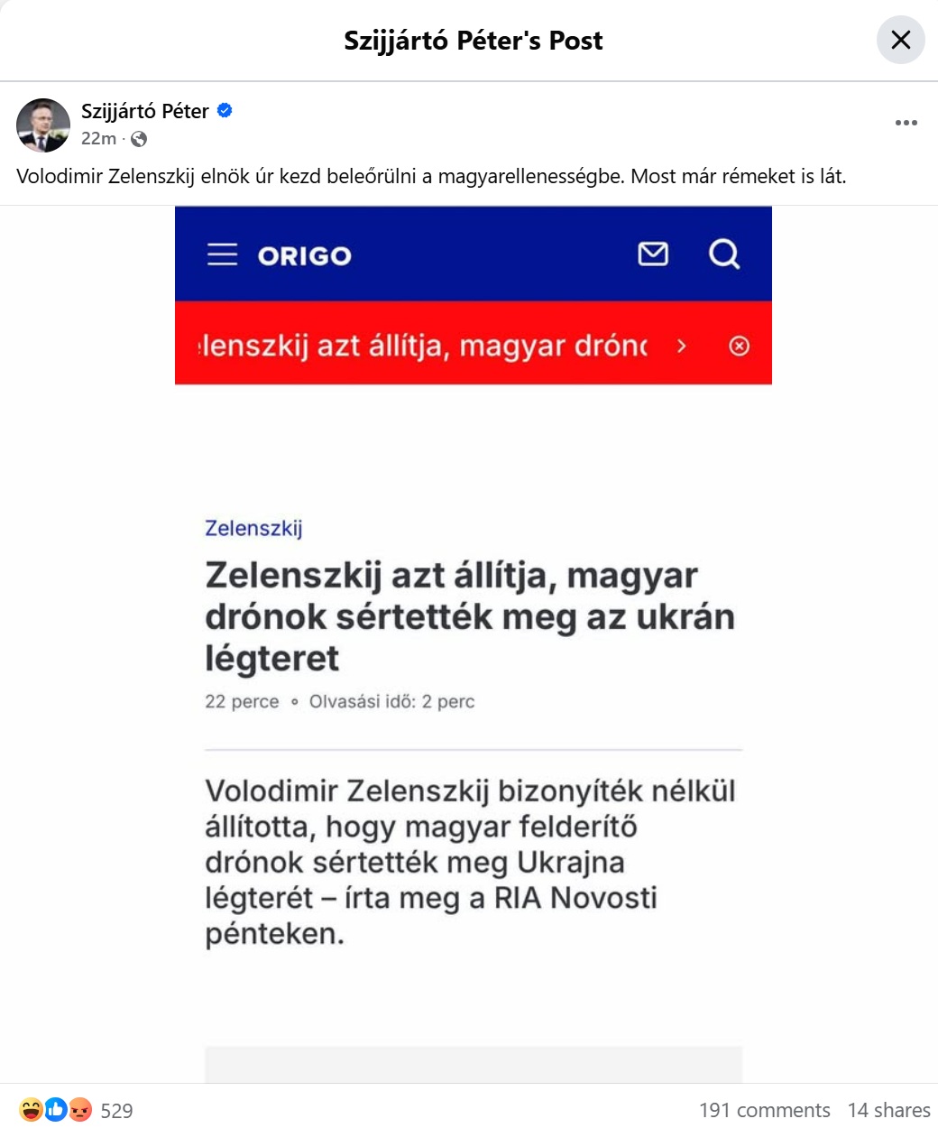 Szijjártó Péter a reakciójához egy Origo-cikket is csatolt, ami a RIA Novosti orosz állami hírügynökségre hivatkozva állítja azt, hogy Zelenszkijnek nincsenek bizonyítékai a drónincidensre. A hírügynökséget Vlagyimir Putyin hozta létre 2013-ban egy elnöki rendelettel.