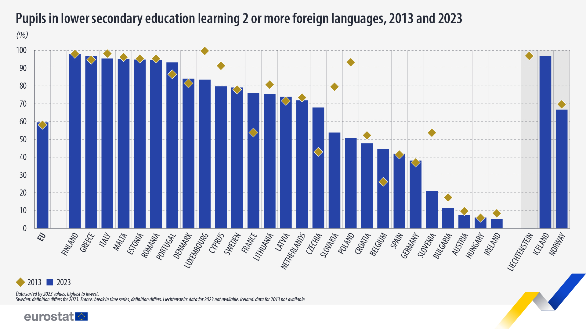 Az alsósok között tizenöt uniós tagállamban nőtt a legalább két nyelvet tanulók aránya, nyolcban csökkent. Előbbiek között van Magyarország is, és ebben a korcsoportban nem is állunk rosszul: az 1,8 százalékos mutató a 16. helyre jó, a régióból megelőzzük vele Ausztriát, Szlovéniát és Csehországot is (de ez az arány magasabb a németek és franciák mutatójánál is).