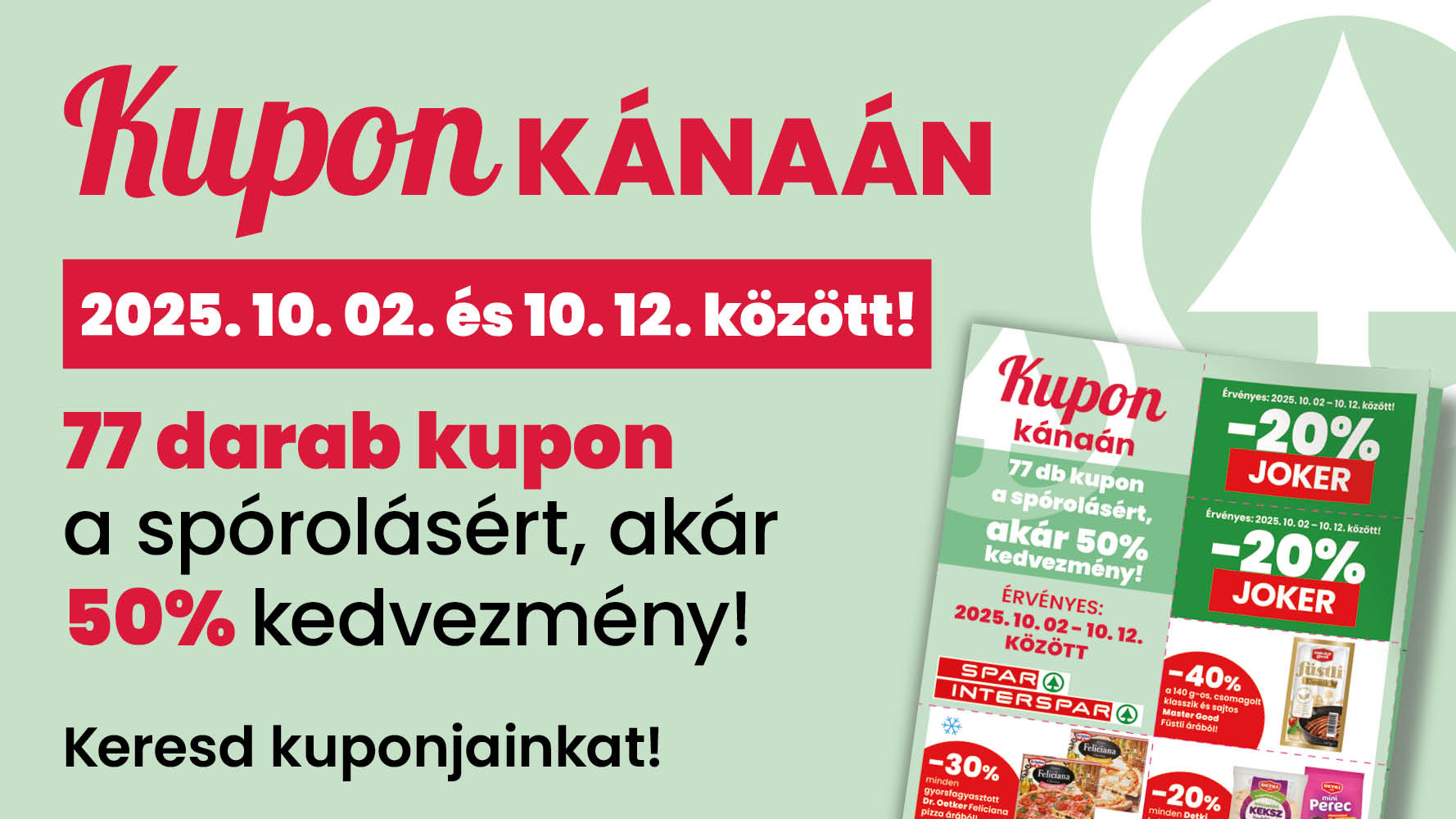 Kapcsold turbóra az őszi bevásárlást a SPAR és INTERSPAR áruházakban! Az új kuponfüzet 2025. szeptember 29. és október 1. között szerezhető be országszerte a promócióban részt vevő áruházakban, miközben a kuponok a MySPAR appban is elérhetőek, a kedvezmények pedig 2025. október 2. és 12. között válthatók be a termékek készletének erejéig. Az őszi SPAR kuponakció keretében két JOKER kupon és összesen 75 kedvezménykupon vár, amelyekkel akár 50%-os árengedményre tehetsz szert a beváltási feltételek szerint. A JOKER kuponok 20% kedvezményt biztosítanak, így a személyes kedvenceidet még kedvezőbb áron szerezheted be.
