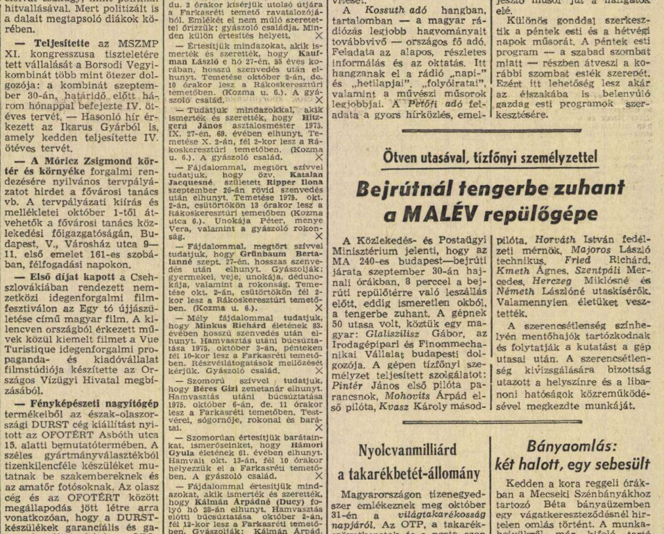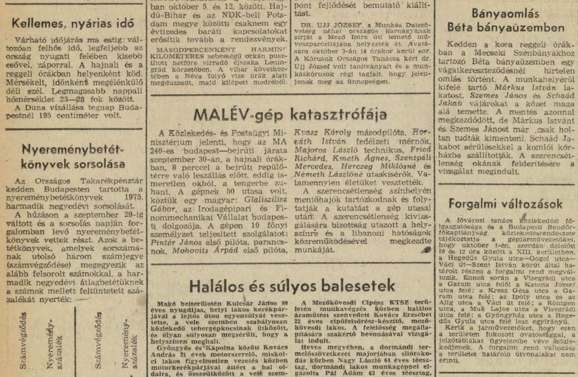 - Hatvan ember vesztette életét 1975. szeptember 30-án, amikor a Földközi-tengerbe zuhant egy leszállásra készülő Malév-gép.