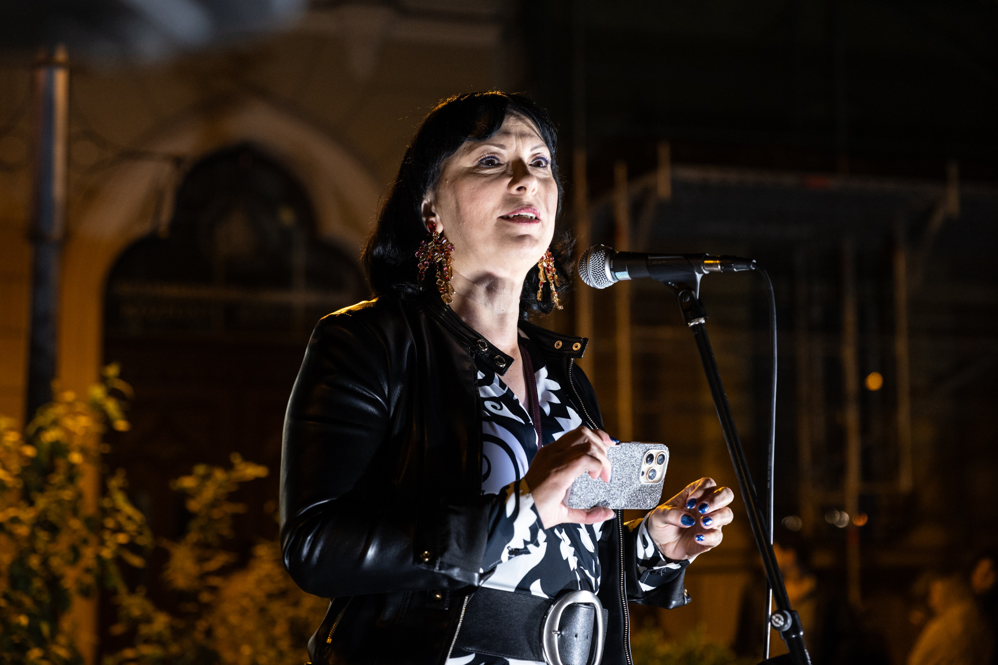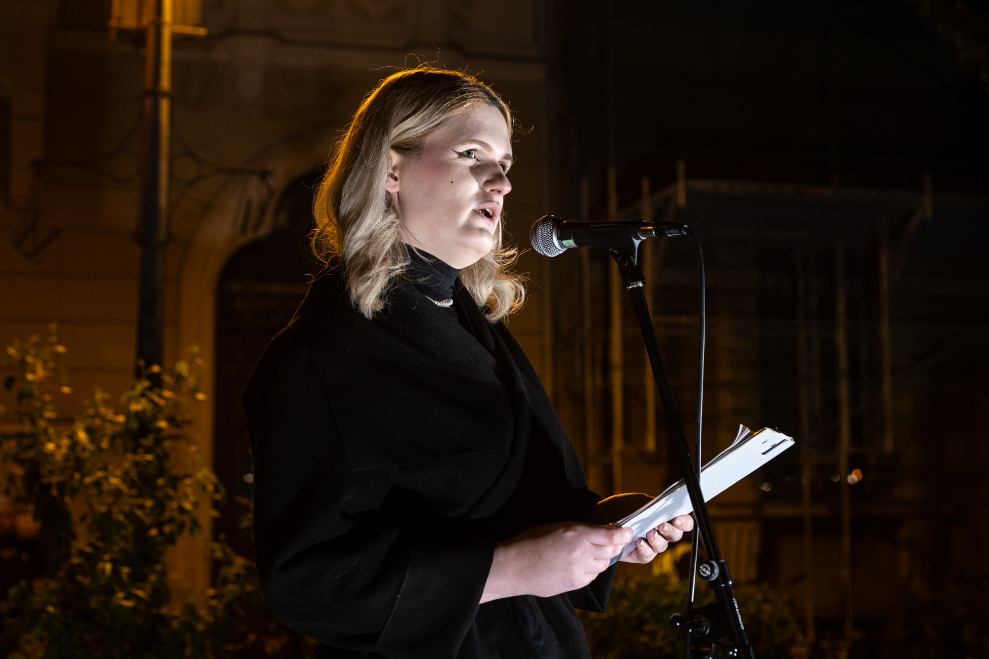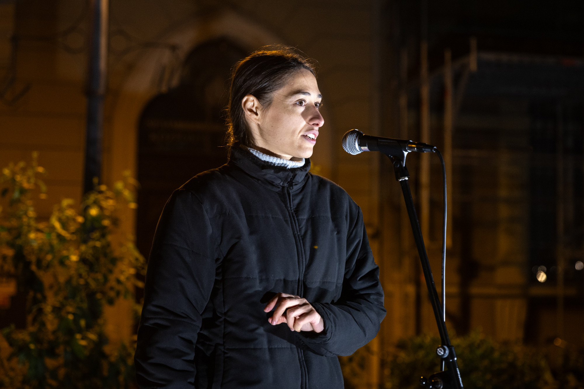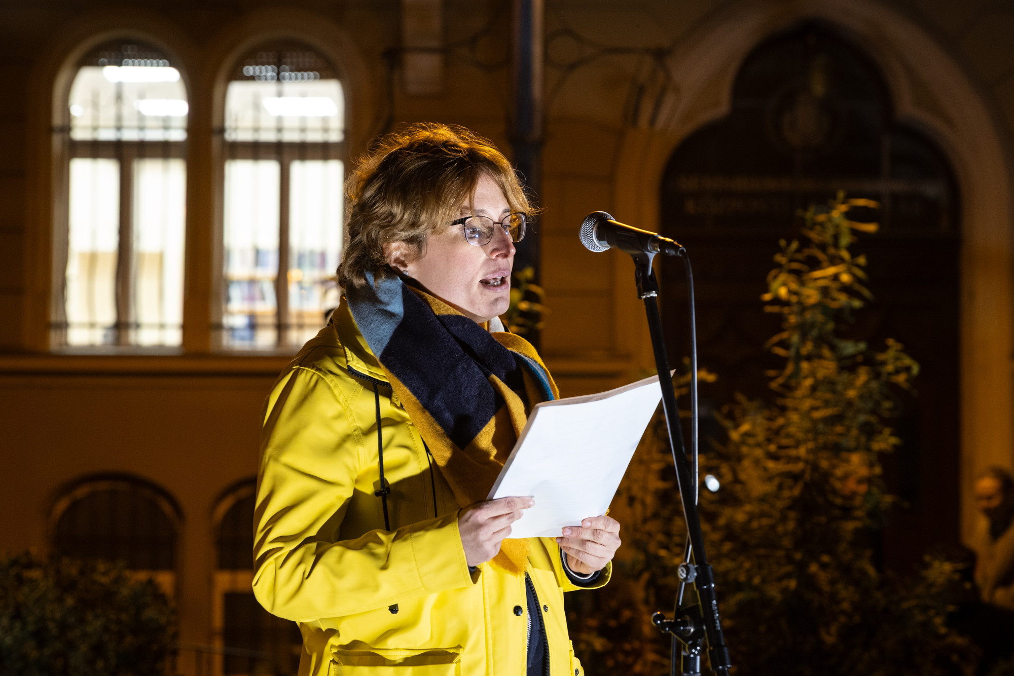 Zsirka Hella, a Háttér Társaság aktivistája következett, aki szerint amíg a döntéshozók nemcsak cinkosai, hanem felbujtói is a kirekesztésnek, addig fel kell szólalni ez ellen. Nem az árt, ha két szerető anyja van egy gyereknek, hanem az, ha emiatt kirekesztik és megbélyegzik. Nem az árt a társadalomnak, ha hagyjuk egymást méltósággal élni, hanem az, ha megosztanak és egymás ellen uszítanak minket – mondta, majd megköszönte a távozó kutatók kiállását.