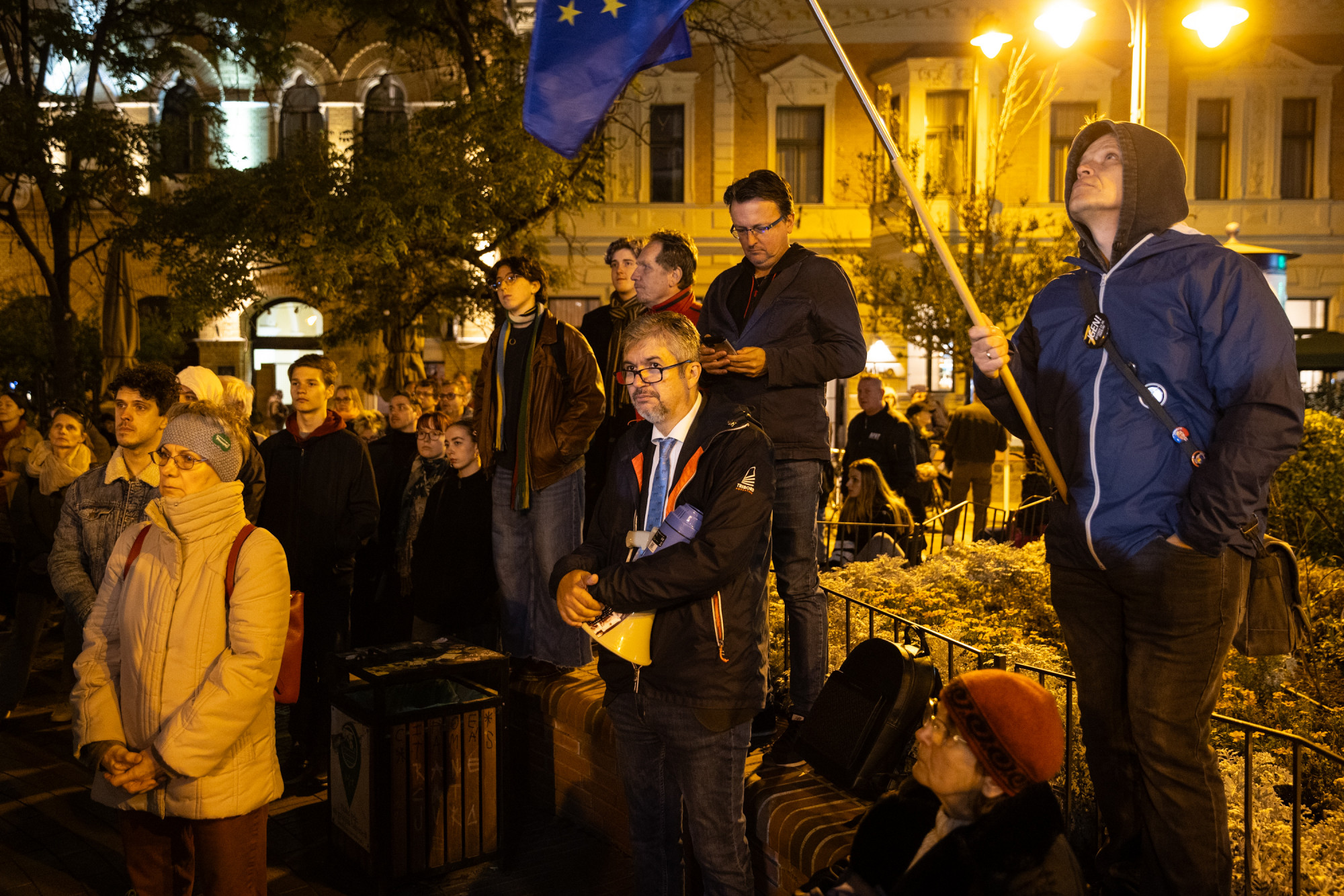 Azért is tűnt teljesen feleslegesnek az ellenőrzés, mert ekkor még csak pár tucatnyian voltak a téren. Hamarosan aztán „Nem hagyjuk abba!” skandálással megérkezett a szokásos keddi tüntetését vezető Hadházy Ákos és menete, így megtelt a tér a Pázmány Péter Katolikus Egyetem bölcsészettudományi karának épülete előtt.