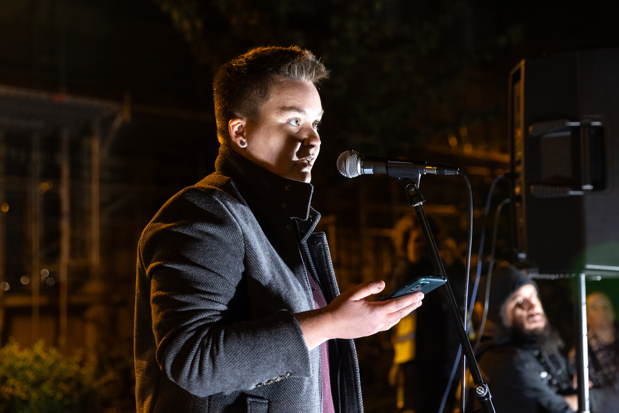 A tüntetés elején a szervezők nevében felszólaló Gömbicz Kata a Pázmányon volt pszichológia szakos hallgató, a katolikus egyetemen BA-n előbb a szivárványcsaládokról, Masteren pedig transz emberek mentális jóllétéről írt szakdolgozatot. (Ahogy korábban írtuk, a transz témájú dolgozatával ő lett a pázmányos Fiatal Kutatói Díj első helyezettje. Csakhogy a díjátadó ünnepségen már nem mutathatta be nyilvánosan a díjnyertes kutatását – így az egyetem ezt inkább a többi díjazottnak sem engedte meg. „Emiatt hoztak aztán egy szabályt az én első helyemet követően: most már LMBTQ-témával nem lehet pályázni az egyetemen” – mondta.)