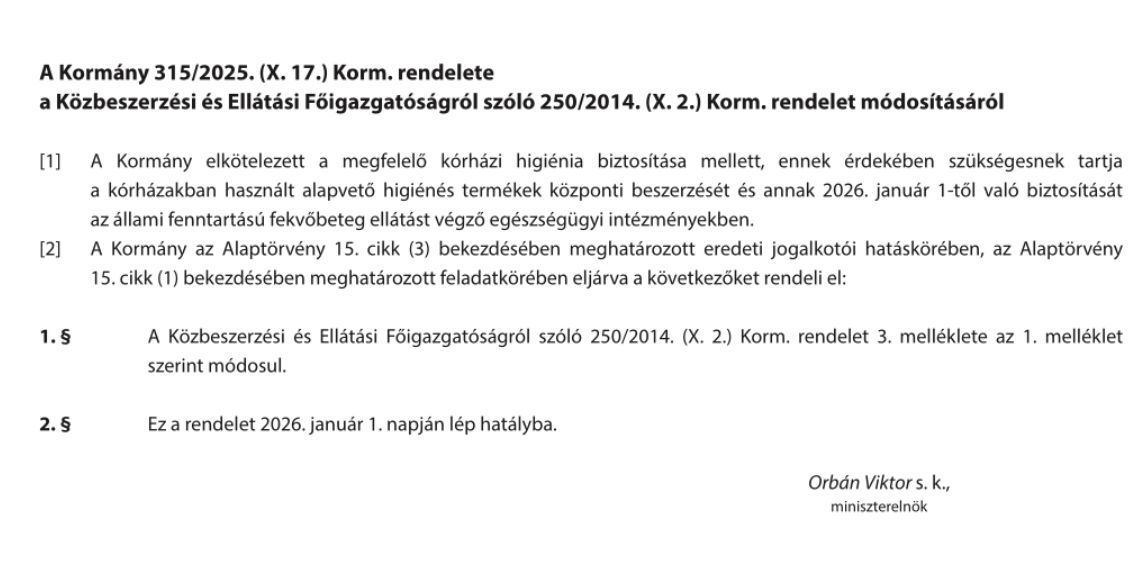 „A kormány elkötelezett a megfelelő kórházi higiénia biztosítása mellett, ennek érdekében szükségesnek tartja a kórházakban használt alapvető higiénés termékek központi beszerzését és annak 2026. január 1-től való biztosítását az állami fenntartású fekvőbeteg ellátást végző egészségügyi intézményekben” - olvasható az Orbán Viktor által szignált péntek esti kormányrendeletben.