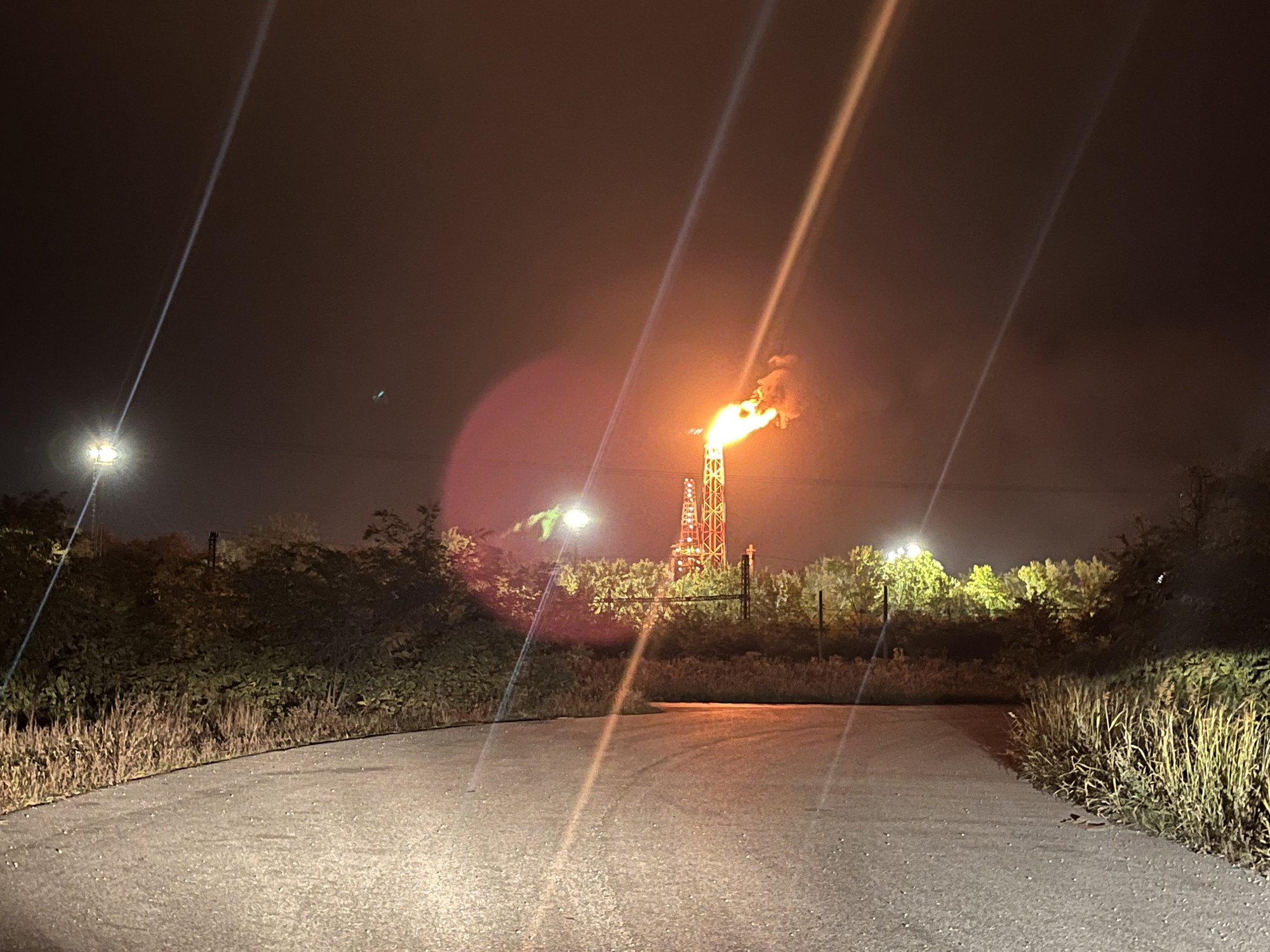 A helyszínre kiérkezett munkatársunk azt írta, „távolabb láttam vízágyúkat dolgozni” a finomítónál, „és pár rendőr ment villogva”. Azt is írta ehhez a fotóhoz, hogy „ezen az oszlopon mindig van láng, de nem ekkora”.