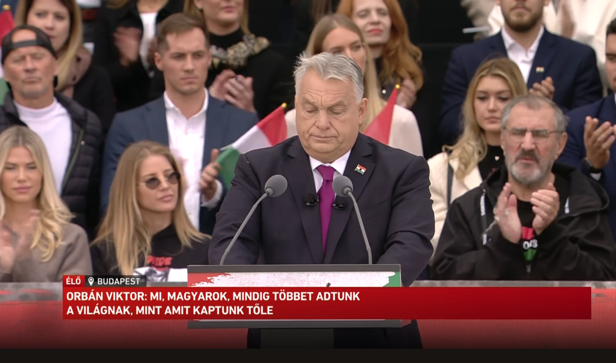 Orbán Viktor október 23-i beszédének színpadképe kifejezőbb volt az elmondott szövegnél is. A rendezők Vasvári Vivien luxusfeleséget és Szabó Zsófi színésznő-influenszert ültették a miniszterelnök mögötti sorba, a szónok mellett őket mutatta leggyakrabban a kamera. Mellettük a végig erősen koncentráló, szurkoló, grimaszoló Eperjes Károlynak jutott hely. A miniszterelnökhöz közeli helyekre egyetlen fideszes politikus sem jutott, helyettük kevésbé ismert művészek és celebek Muri Enikő, Szelba „Cooky” Krisztián, többnyire fiatal vagy annak látszani igyekvő felnőttek (képünk bal felső sarkában például a hátra fordított bézbólsapkát viselő Patkó „Kiki” Béla [68]) kerültek.