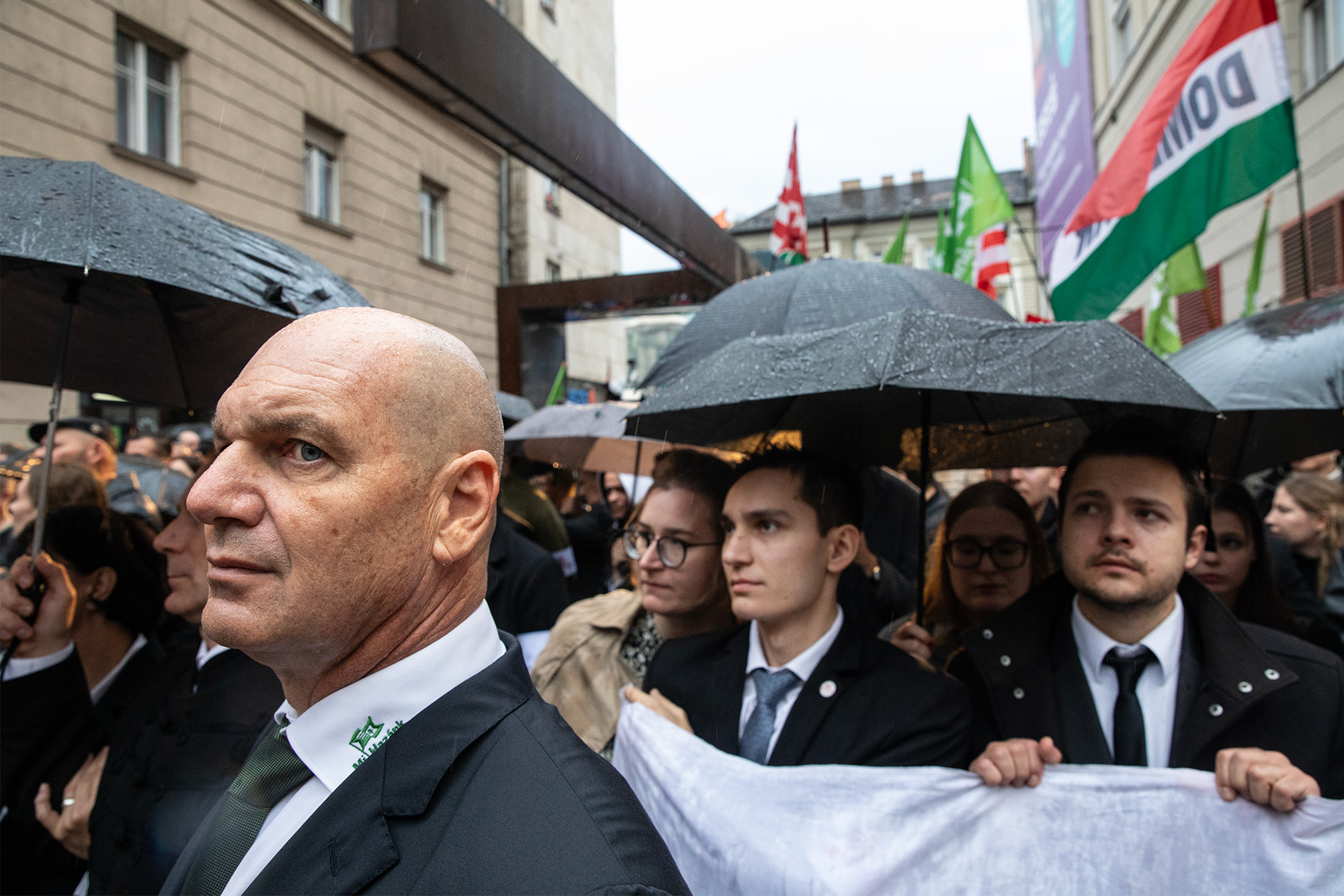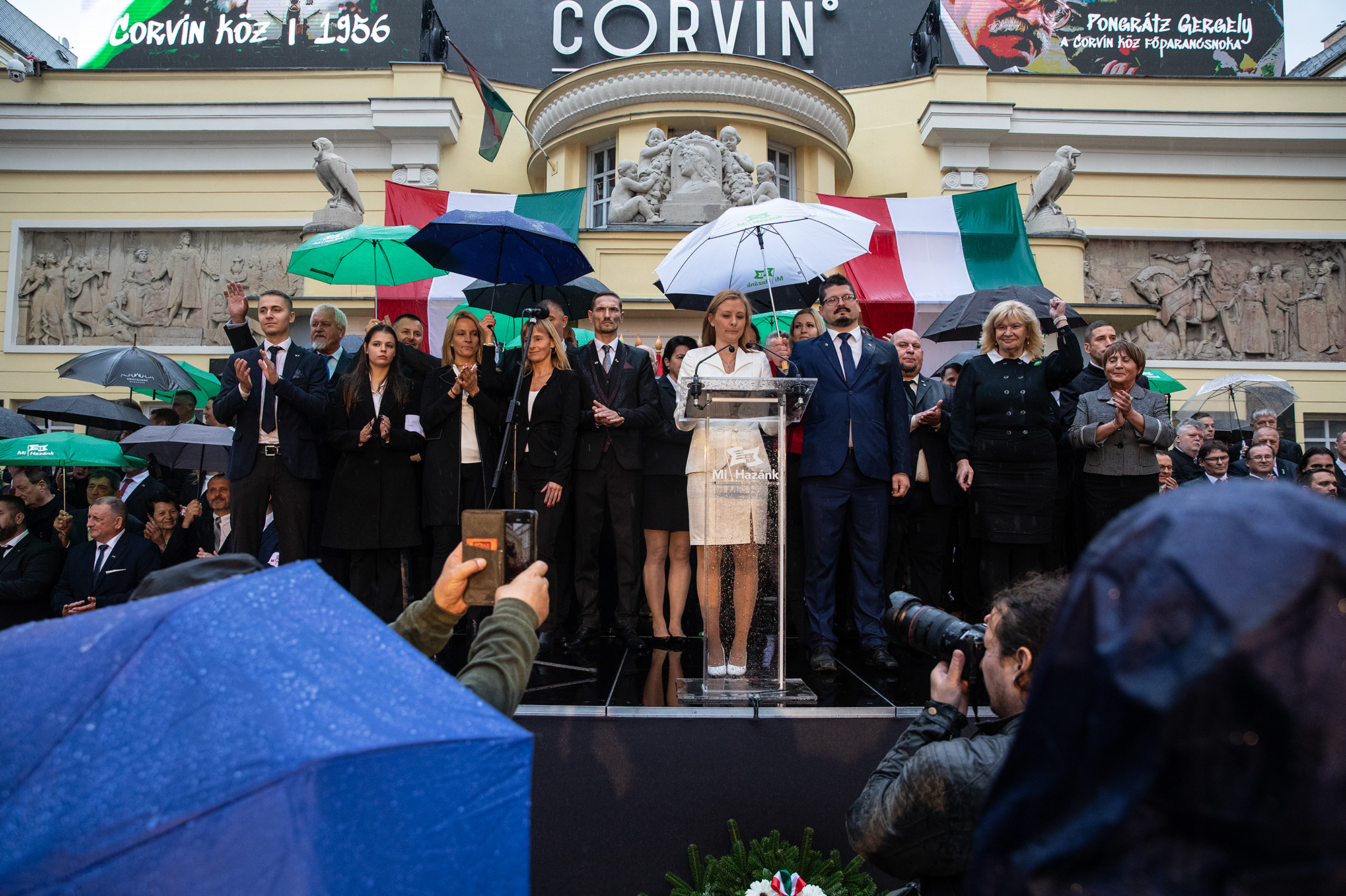 Az M3 nyugati téri aluljáróban még többségben voltak a fideszesek, míg az Arany János megállója tiszásokkal volt tele. Ahogy azonban a Corvin közhöz közeledtünk, egyre több a katonai kabátba, a fehér fűzős bakancsba és a Mi Hazánkos zöld zászlóba botlottunk. A már megszokott, közel ezer fős csapat gyűjt össze a forradalom egyik emblematikus helyszínén, hogy a szemerkélő esőben állják végig a nemzeti radikális párt ‘56-os műsorát.