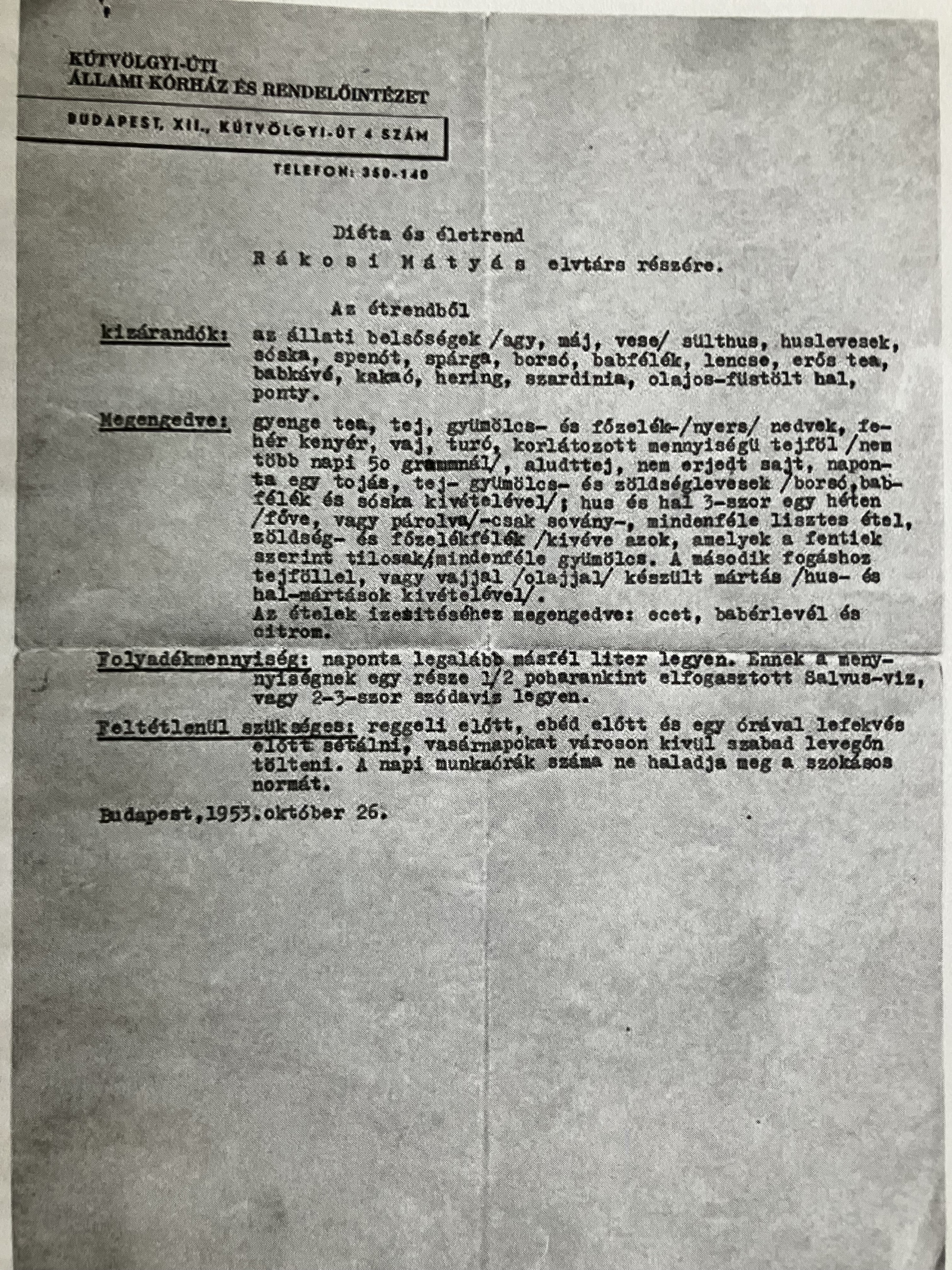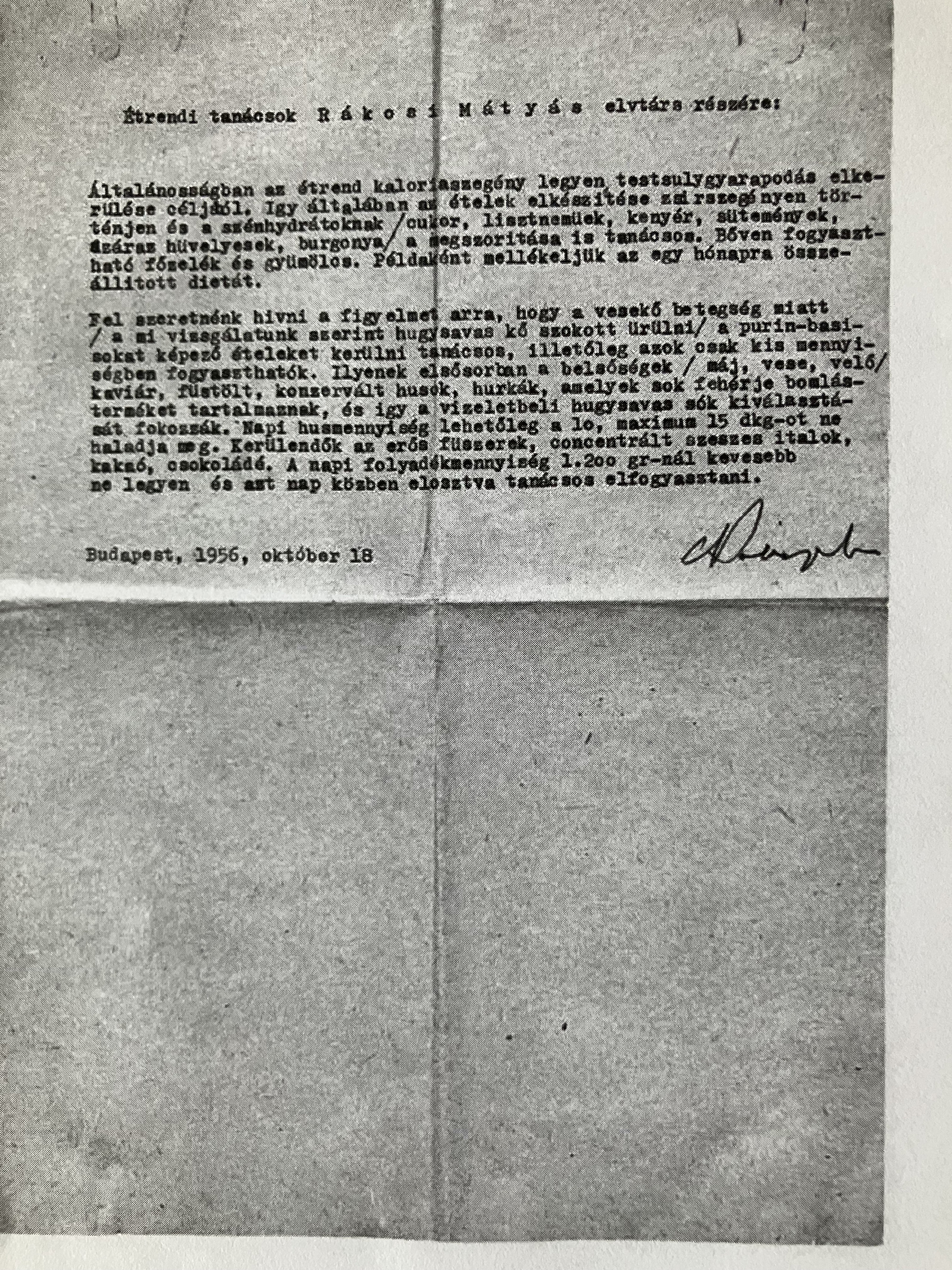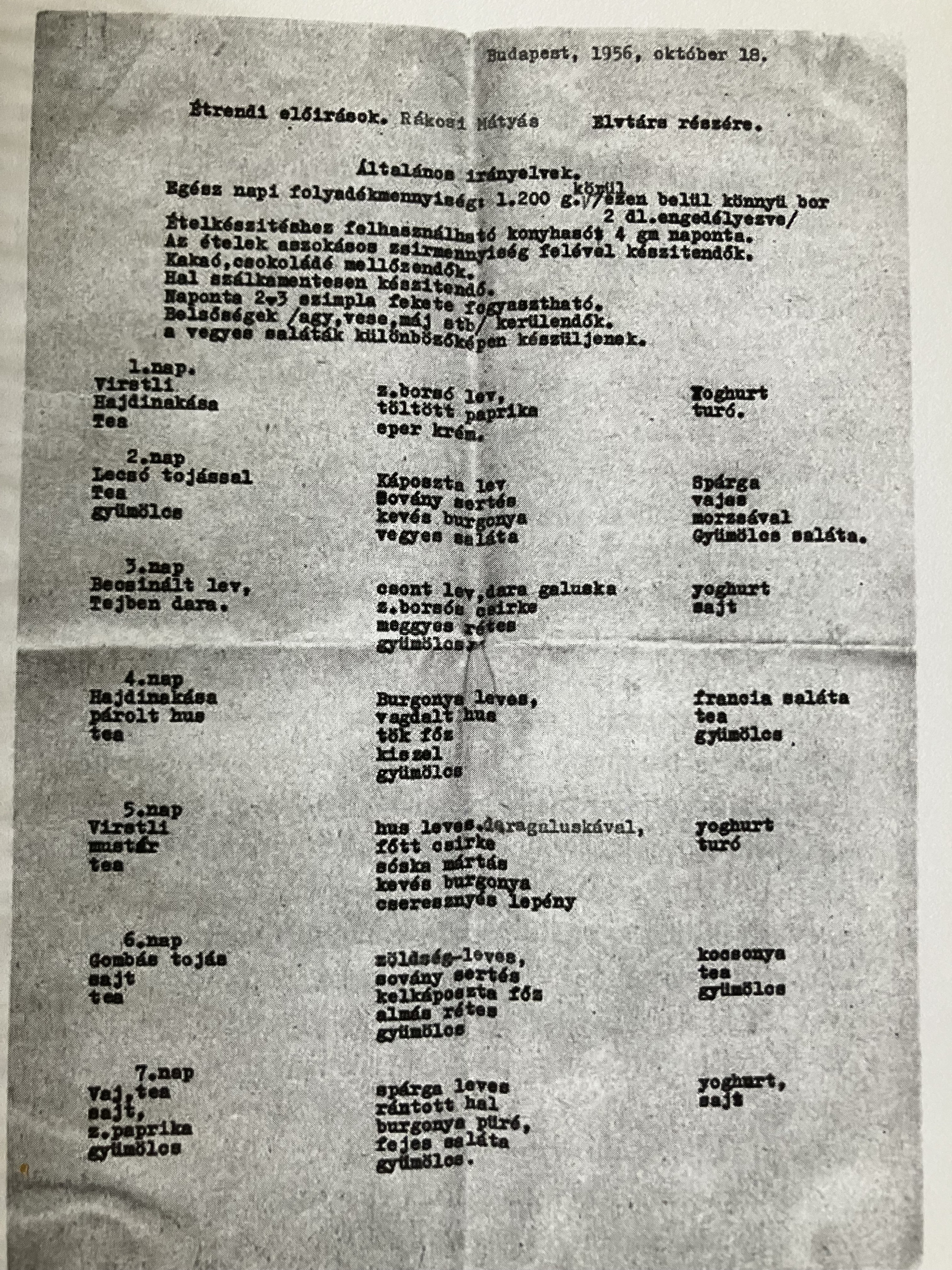 Ezekben a napokban juttatták ki hozzá Budapestről két, ismeretlen orvos által készített dokumentumot. Az egyik Rákosi egészségi állapotát írta le, és tanácsokkal szolgált. A másik egy diéta, mit szabad enni a bukott, pardon, gyógykezelésen tartózkodó pártvezetőnek ennie reggelire, ebédre és vacsorára.