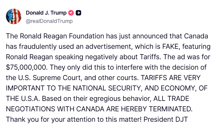 Donald Trump amerikai elnök bejelentette, hogy azonnali hatállyal befejez minden kereskedelmi tárgyalást Kanadával, mert az országban egy olyan hirdetést tettek közzé, ami kritizálja az általa bevezetett vámokat.