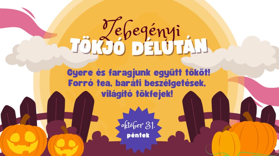 „Zebegényi tökjó délután! Faragjunk együtt tököt, gyújtsunk mécsest, és világítsuk be közösen az őszi estét! 15 db tökünk lesz a Zebegényi Zöldséges jóvoltából, természetesen lehet sajátot is hozni. Faragóeszközt érdemes hozni, pl fúróval is lehet szépeket alkotni, de az pont van itt is. Mécseseket biztosítunk.”