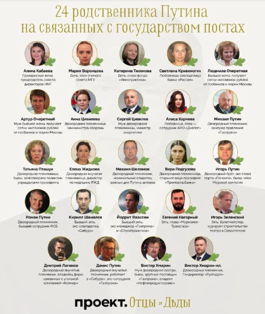 Vlagyimir Putyin orosz elnök minimum 24 családtagjának segített állami hivatalhoz jutni, állítja a Projekt című projekt. A kiadvány újságírói szerint Putyin lányai, unokatestvérei, másodunokatestvérei is az államtól származó jövedelmeket élvezhetnek. Mellettük azok is, akikkel hivatalos vagy nem hivatalos kapcsolatban állt, a volt feleségétől, Ljudmila Ocseretyinától Szvetlana Krivonogihon és Alisza Harcseván át mostani állítólagos partneréig, a tornász olimpiai bajnok Alina Kabajeváig.
