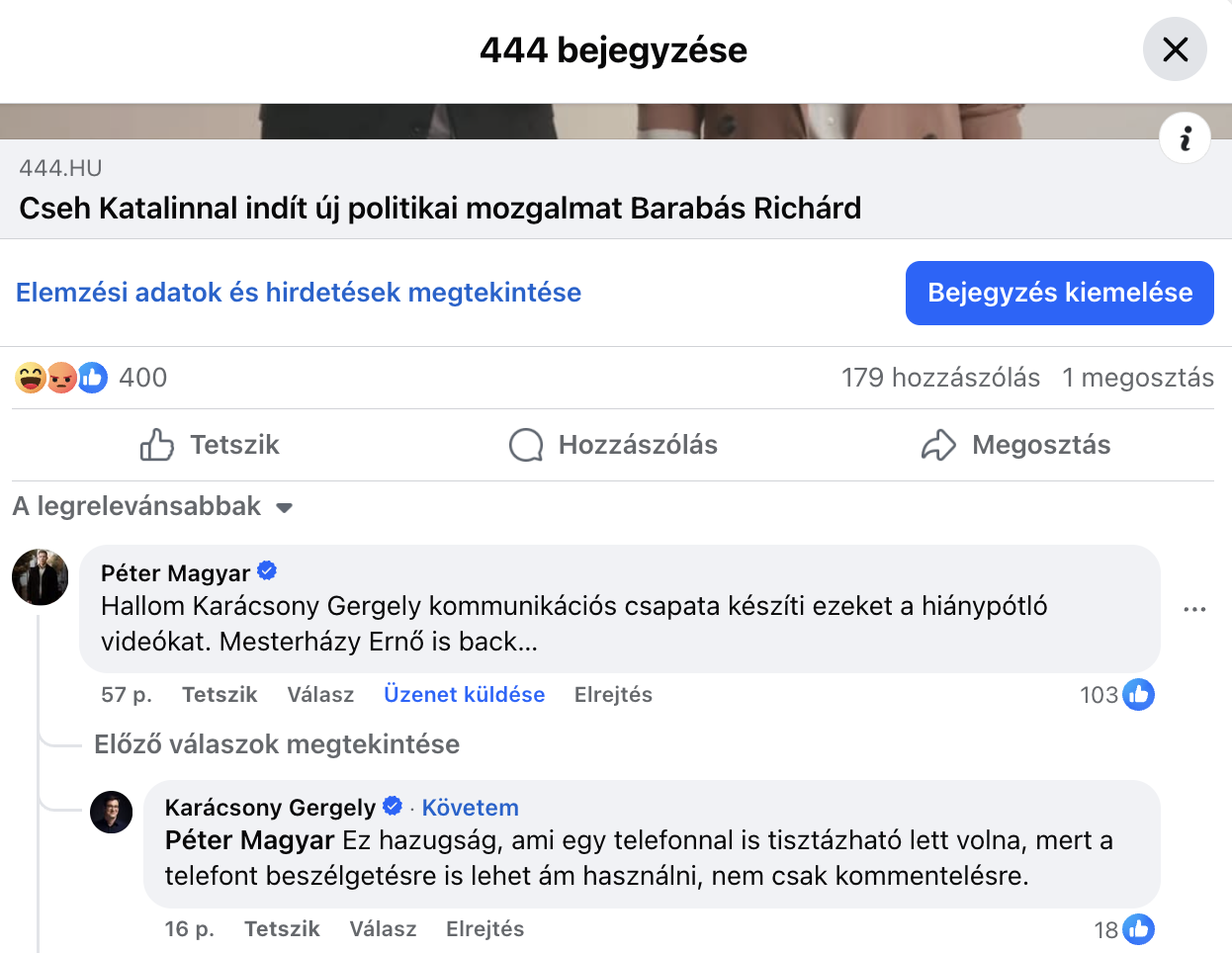 Miután megírtuk, hogy Cseh Katalinnal indít új politikai mozgalmat Barabás Richárd, és ezt a hírt ki is posztoltuk Facebook-oldalunkra, a kommentelők közt perceken belül ott termett Magyar Péter, hogy közölje: „Hallom Karácsony Gergely kommunikációs csapata készíti ezeket a hiánypótló videókat. Mesterházy Ernő is back...”