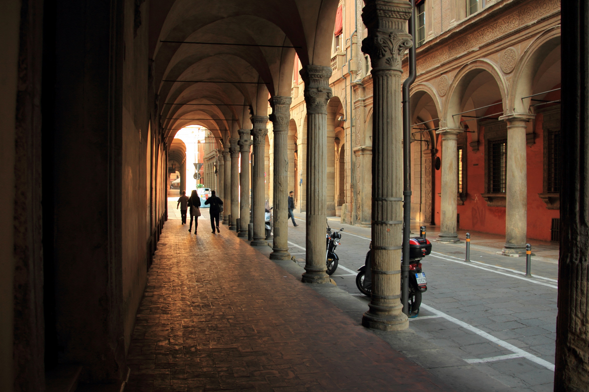 A városközpontot átszövő körülbelül negyven kilométernyi árkád úgy a város egyik látnivalója, hogy valójában nem is látnivaló, mivel szinte minden háznál árkádok alatt sétál az ember, esőtől-hótól-tűző napsütéstől védve. Árkádok alatt veszed a kávét, a fagyit, a mortadellás szendvicset, árkádok alatt böngészed a végtelen falfirkákat, árkádok alatt eszed az ebédet és árkádok alatt bámulod a kirakatokat.