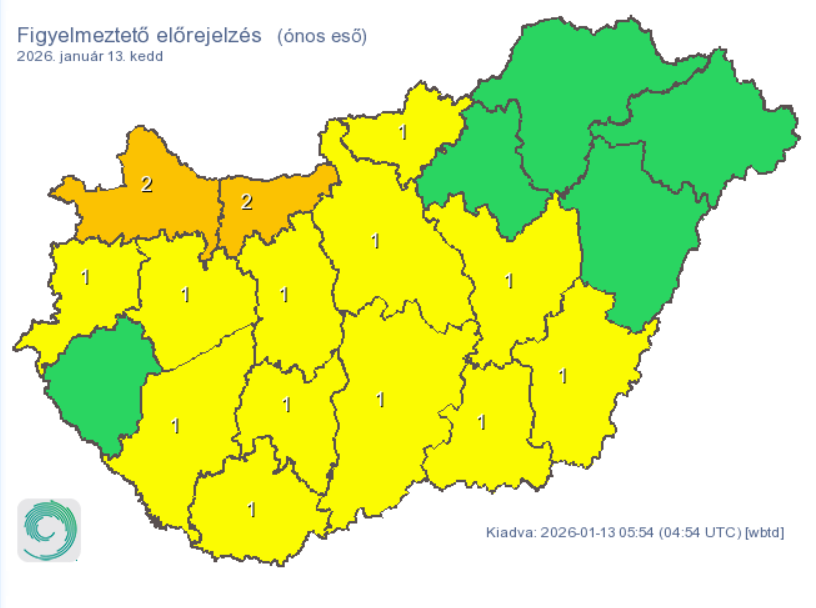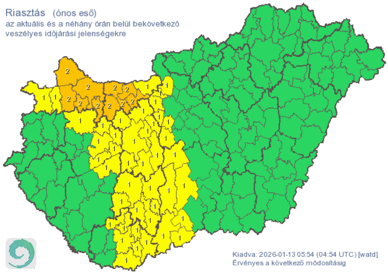 Hajnali öt óra óta van érvényben a másodfokú riasztás Győr-Moson-Sopron teljes területén, illetve Komárom-Esztergom egy részén. Itt több mint 1 milliméter ónos eső esett, a következő órákban további eső várható.