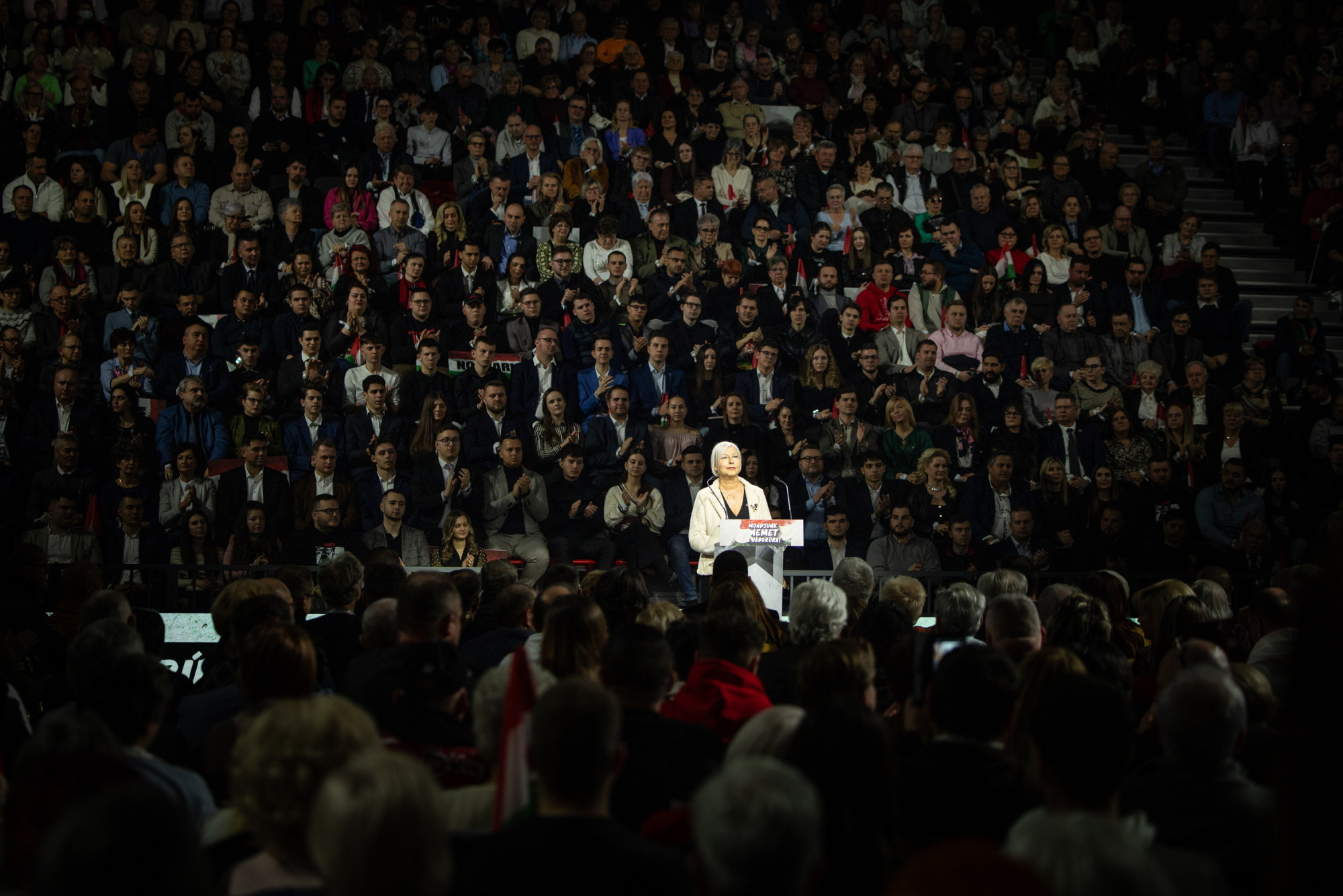 Az is újdonság volt, hogy nemcsak a polgármester (oké, Szegeden furcsa lett volna), hanem már a képviselőjelöltek is megszólaltak. Csöbör Katalin, aki 2010 óta a Fidesz miskolci országgyűlési képviselője és Hollósy András alpolgármester. Ő új jelölt, a 2022-es győztes Kiss Jánost lecserélték. (Erősorrendünkben mindkét miskolci választókerületben a Tisza vezetését feltételeztük.) Mindketten csak egyszer-egyszer emlegették a Tisza elnökét. „Möszjö Magyar nem merte idetolni a szebbik felét” – mondta például Hollósy, aki egyébként Csöbörhöz képest jóval erősebb sodrású szónok. Orbánék nem most fedezték fel, egy ideje már ő a térség kohéziójáért felelős miniszteri biztos.