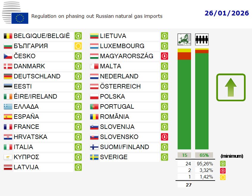 Döntöttek az Európai Tanácsban: 2027 végétől minden orosz fosszilis energiahordozó importját megtiltják az EU-tagállamoknak. A tiltást a 27 tagállamból 24 szavazta meg, Bulgária tartózkodott, Szlovákia és Magyarország ellene voksolt, a rendeletet elfogadó országokban él az uniós népesség 95,26 százaléka. Az elfogadáshoz 15 tagállam vagy 65 százaléknyi népességarány kellett.