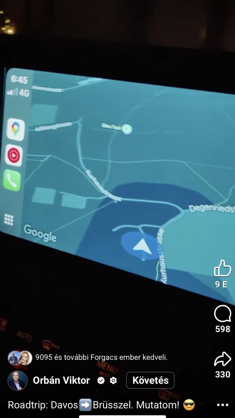 A képviselő egy videóból tudta meg a helyszínt, amit Orbán Facebookjára posztoltak ki a davosi eseményről és amin látszik az autó GPS-e. Ebből:
