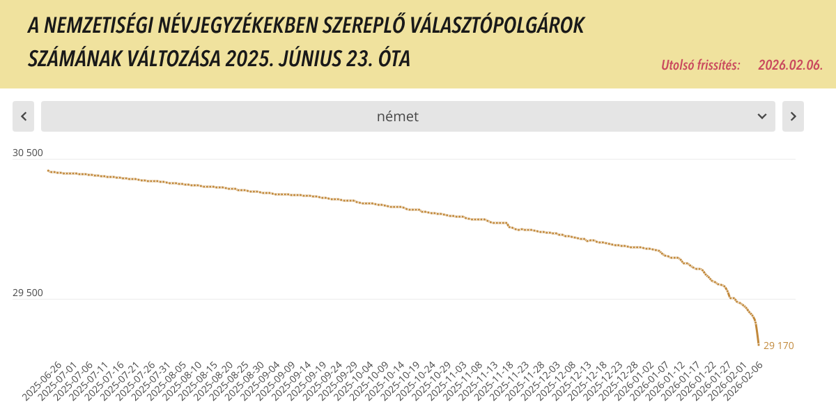 Az elemző cég megfigyelése szerint bő fél évig átlagosan napi két-három fővel csökkent csak a létszám, az elmúlt három hétben viszont már átlagosan naponta 30-an is úgy döntöttek, hogy a nemzetiségi lista helyett inkább ők is pártlistára szeretnének szavazni április 12-én. Péntekre már 29170-re csökkent a német nemzetiségi névjegyzékre feliratkozottak száma, ami aggasztó lehet a Fidesznek, hiszen a korábbi három választás során 22-24 ezer szavazatra volt szükség szüksége egy nemzetiségnek ahhoz, hogy mandátumot szerezzen. 2022-ben még például 30 ezer fölött volt a regisztráltak száma. És mivel idén eleve magasabb részvételre lehet számítani, a Political Capital úgy értékeli, hogy ha nem ér véget a leiratkozási hullám, akkor egyre valószínűbb, hogy nem fog újra mandátumot szerezni a német nemzetiségi lista.