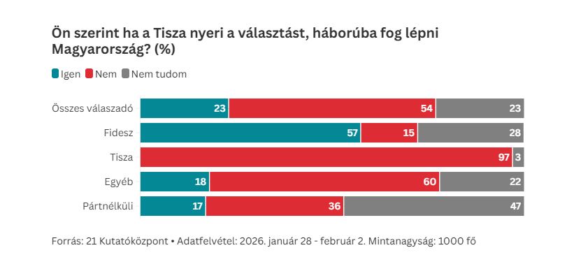Eszerint a magyar társadalom 23 százaléka gondolja azt, hogy a Tisza győzelme esetén Magyarország háborúba lépne, és csak 54 százalék válaszolt úgy, hogy ez nem történhet meg. További 23 százaléknak nincs egyértelmű álláspontja vagy nem akart véleményt alkotni.