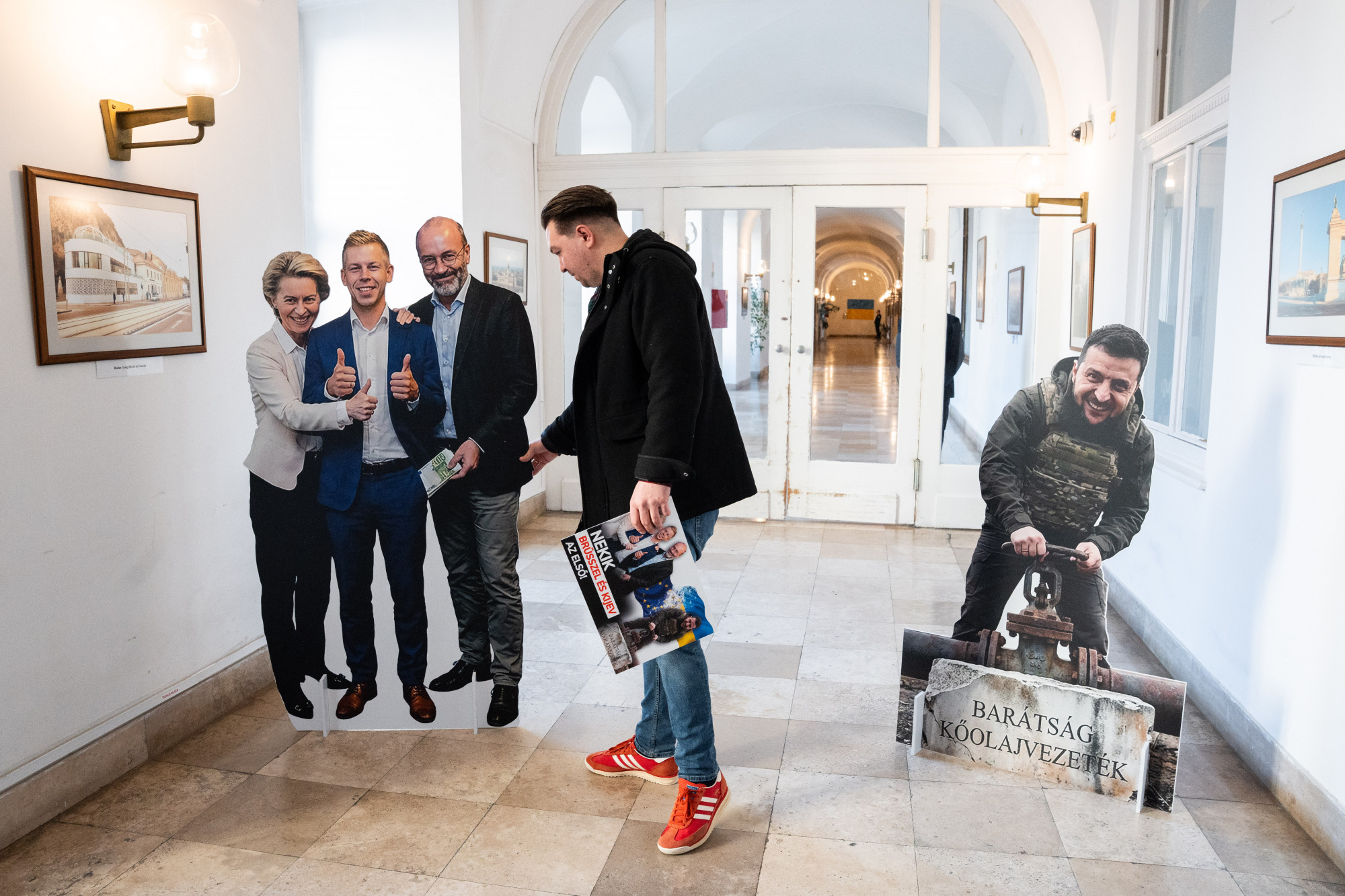 A bábuk közül Zelenszkij éppen a Barátság kőolajvezetéket zárta el a jobb oldalra helyezve, Magyart pedig a baloldalon ölelgette von der Leyen és Weber, szerintem nem nagyon kell magyarázni, mit akartak ezzel szemléltetni a Fidelitas aktivistái.