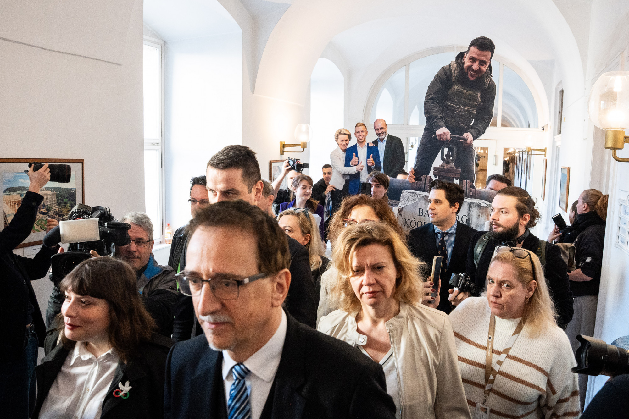 A napirend alapján nagy izgalmak nem várhatók, azzal legfeljebb a Fidelitas szolgált még az ülés előtt, amikor - hommage á Pócs János - életnagyságú Magyar Péter, Ursula von der Leyen, Manfred Weber és Volodimir Zelenszkij kartonbábukkal várta a Tisza-frakció bevonulását.
