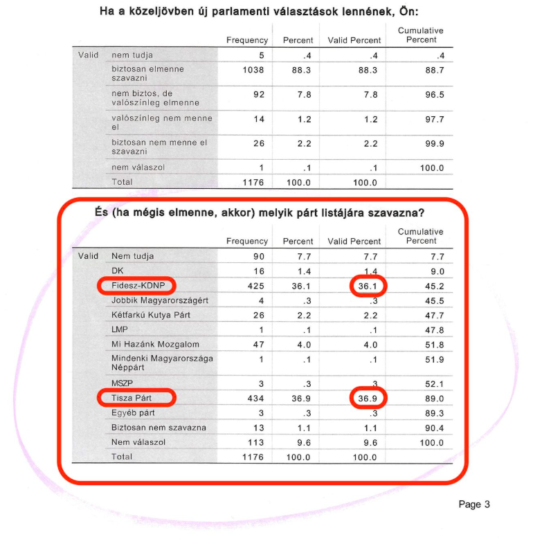 Deák nyilvánosságra hozott több táblázatot, az egyikben található adatokon az látszik, hogy a Fidesz 36.1, a Tisza 36.9 százalékon áll. Az előtte lévő táblázatban az szerepel, hogy ha a közeljövőben választások lennének, akkor elmenne-e szavazni, majd a megoszlás, hogy hányan biztosan, hányan nem biztosan és így tovább.