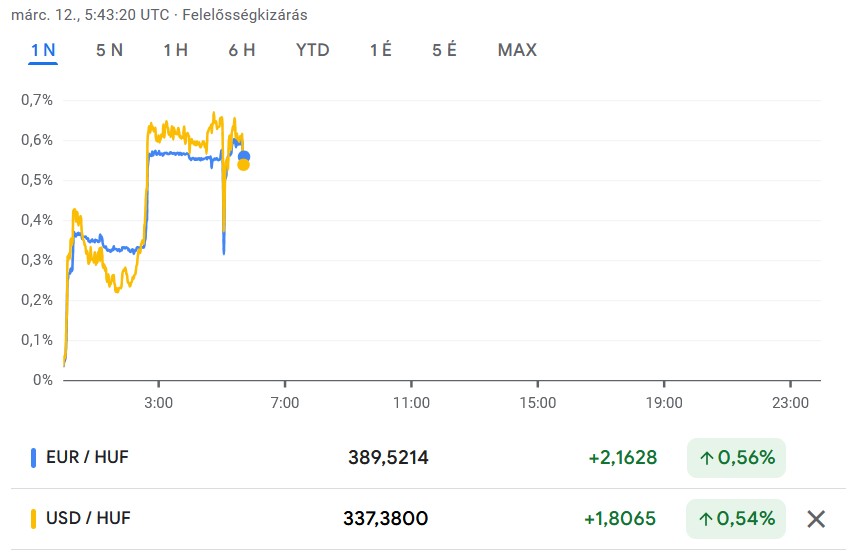 A piaci pánik a devizapiacokra is visszatért. A forint újból gyengülni kezdett, az euró árfolyama a 390-es szintnél van (szerda hajnalban még 383-384 között volt). A dollár is drágulni kezdett: a szerda hajnali 330-as szintről 337-338 forint közé emelkedett az ára. Igaz, ezek még szintén kedvezőbbek, mint a hét eleji árfolyamok voltak.