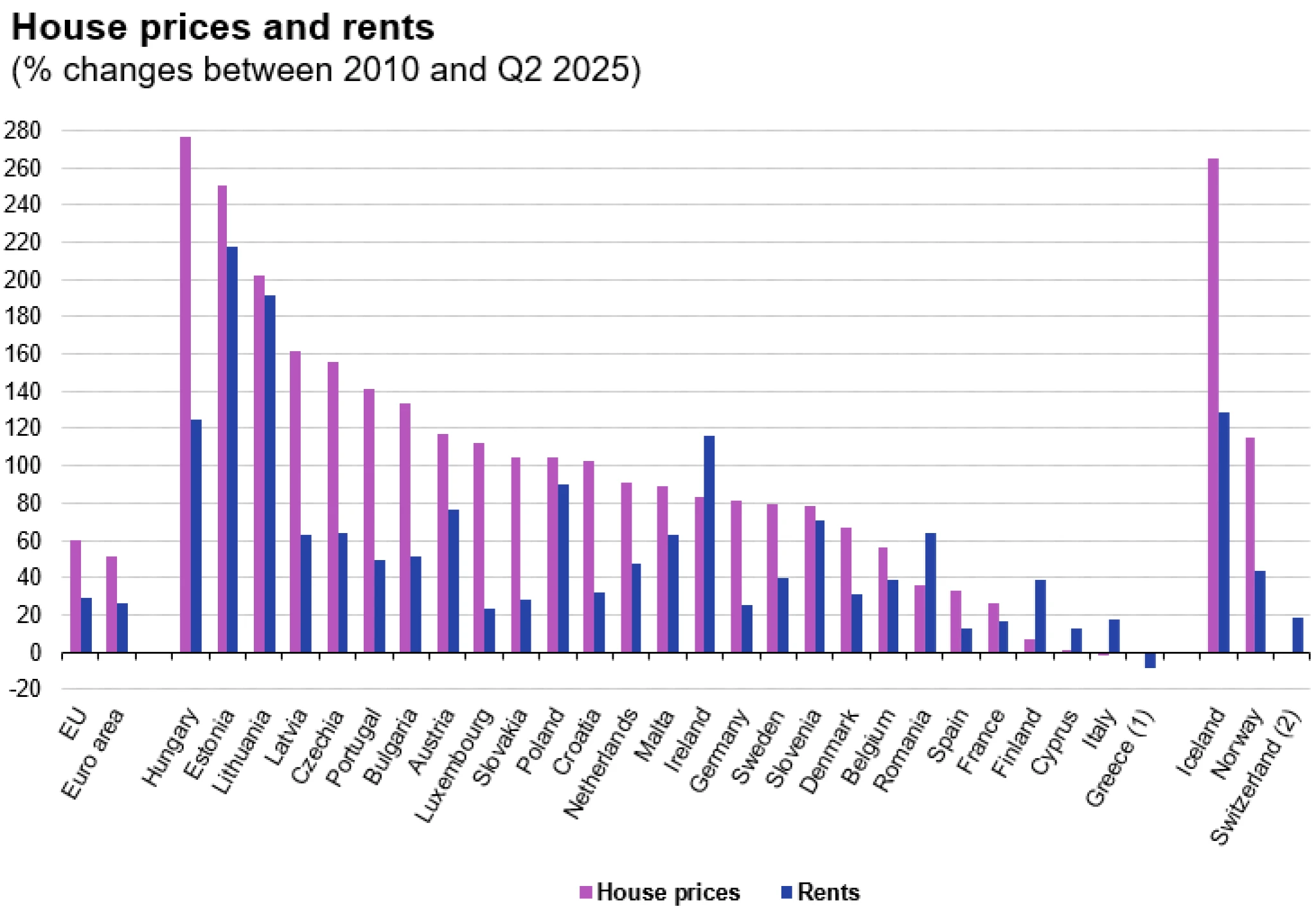 Ennél szemléletesebb adat, hogy a lakásoknál a hazai árak közel megháromszorozódtak (+277%) összehasonlítva a 2010-es árakat 2025 második negyedévével, míg Franciaországban 30 százalék alatt maradt az emelkedés. Hasonlóak az eltérések a bérleti díjaknál is.